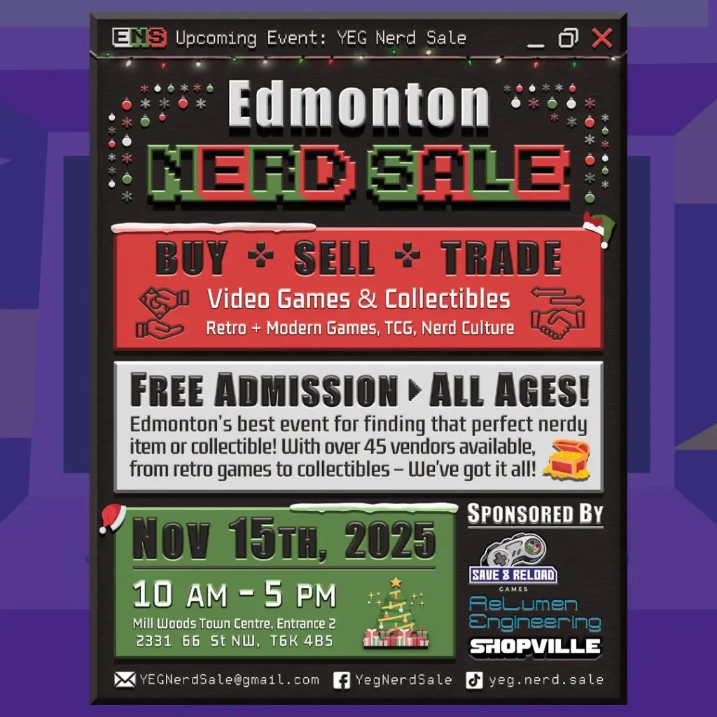 Hey Edmonton! As the main sponsors for this event, we’re thrilled to announce the Edmonton Nerd Sale is coming up fast on November 15, 2025, at Mill Woods Town Centre (Entrance 2, 2331 66 St NW, T6K 4B5). The show itself is bigger than ever, and so is our booth!