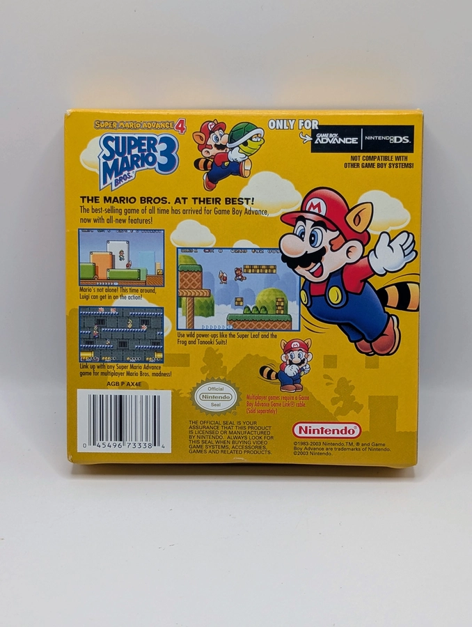 Experience one of the most beloved entries in the Mario series with Super Mario Advance 4: Super Mario Bros. 3, a stunning and enhanced remake for the Game Boy Advance. This version updates the timeless classic with improved, colorful GBA graphics and sounds, maintaining all the iconic world design, innovative power-ups (like the Super Leaf and the Frog Suit), and imaginative level structure that made the original a masterpiece. Beyond the core adventure of battling the Koopalings and Bowser, this GBA title includes a dedicated e-Reader support system (if the cards are available) to unlock hundreds of additional, brand-new levels and bonus challenges, offering incredible replay value and arguably making it the definitive way to play Super Mario Bros. 3.