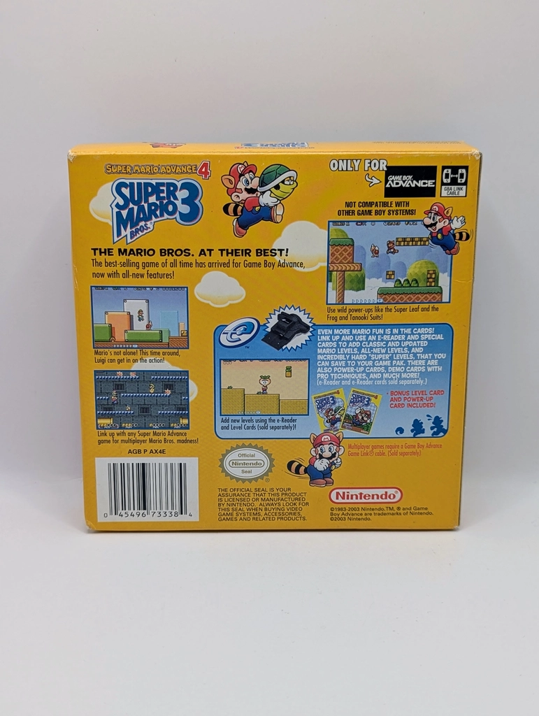 Experience one of the most beloved entries in the Mario series with Super Mario Advance 4: Super Mario Bros. 3, a stunning and enhanced remake for the Game Boy Advance. This version updates the timeless classic with improved, colorful GBA graphics and sounds, maintaining all the iconic world design, innovative power-ups (like the Super Leaf and the Frog Suit), and imaginative level structure that made the original a masterpiece. Beyond the core adventure of battling the Koopalings and Bowser, this GBA title includes a dedicated e-Reader support system (if the cards are available) to unlock hundreds of additional, brand-new levels and bonus challenges, offering incredible replay value and arguably making it the definitive way to play Super Mario Bros. 3.