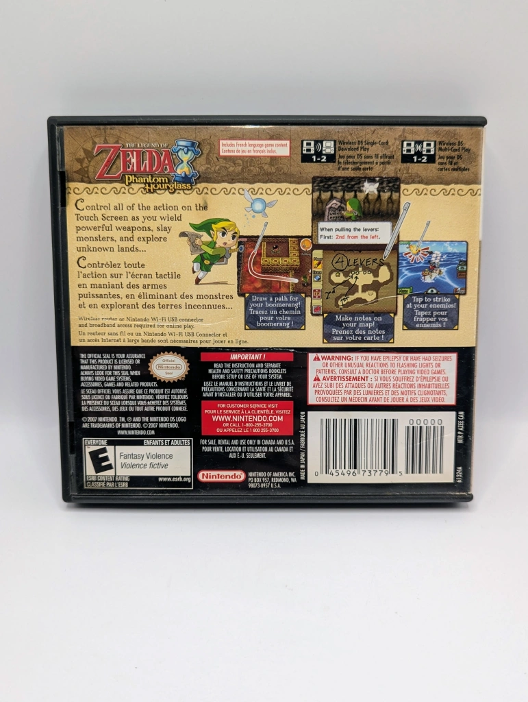 The Legend of Zelda: Phantom Hourglass is the direct sequel to The Wind Waker, continuing Link’s seafaring adventures across a vibrant, cel-shaded Great Sea on the Nintendo DS. The game is a major milestone for the series, as it was designed entirely around the DS’s innovative touch-screen controls, which lets you control Link’s movement, sword combat, and the path of items like the boomerang with the simple swipe and tap of the stylus. As Link, you must rescue the kidnapped Tetra from a mysterious Ghost Ship, leading you on a quest that introduces the charming and cowardly Captain Linebeck. The game features the recurring, massive dungeon, the Temple of the Ocean King, where Link is constantly racing against a time limit set by the titular Phantom Hourglass, forcing you to utilize stealth and clever shortcuts to progress. This title is a unique, charming, and highly interactive adventure that perfectly adapts the classic Zelda puzzle-solving and exploration formula to a handheld console.