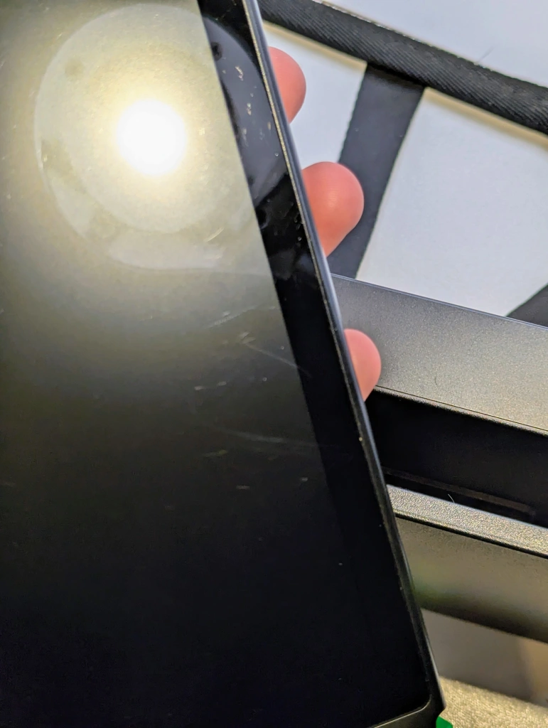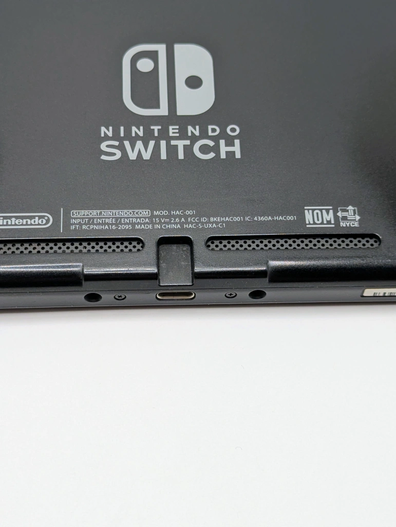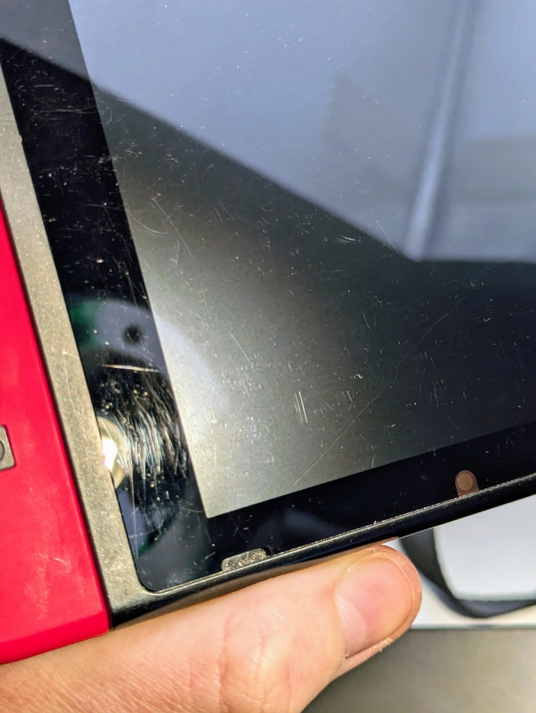 With Neon Pink & Neon Green Joy-Cons. Scratches bottom left frame screen, and couple top center (doesn’t affect game play).