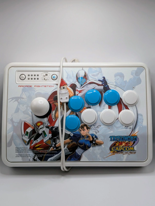 Elevate your competitive edge with the Tatsunoko vs. Capcom: Ultimate All-Stars Arcade FightStick, the premier way to experience this legendary Wii crossover fighter. Designed specifically for the high-intensity gameplay of the Vs. series, this controller features an authentic 8-button arcade layout with a high-performance joystick that delivers precision and tactile feedback far beyond standard gamepads. The faceplate is adorned with exclusive, vibrant artwork featuring iconic characters from both the Capcom and Tatsunoko universes in a sleek matte finish. To ensure a seamless gaming experience, the stick connects directly to your Wii Remote, utilizing its Bluetooth connection for a lag-free wireless setup that keeps your gaming area clean. With added weight for stability during heavy combos and a built-in Turbo function for every button, this FightStick isn’t just a controller—it’s an essential piece of equipment for any serious fighting game fan looking to dominate the competition.