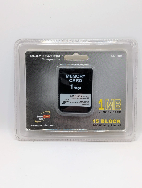 This is a third-party memory card, Model No. PSX-100, manufactured by Century Concept Digital, designed for the original PlayStation (PSX/PS1) console. It is an essential accessory for retro gamers, providing 1MB of storage, which translates to 15 blocks for saving game progress and data. The card is compatible with the PlayStation 1 and can also be used with the PlayStation 2 (PS2) for saving PS1 games only. As a crucial component, this card allows players to save and reload their progress, ensuring they can continue their favorite PS1 adventures.