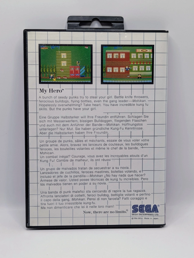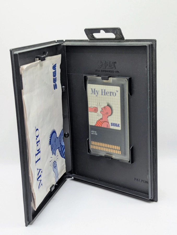 Become a street fighting champion in My Hero, an early and surprisingly deep side-scrolling beat-’em-up for the Sega Master System! You control a young martial artist named Jackie who must fight his way through hordes of street thugs and villains to rescue his kidnapped girlfriend, Maria. Unlike many simple brawlers of the era, this game features two unique, intense boss battles—a towering martial arts master and a giant mechanical robot—that punctuate the action and test your fighting skills. With its colorful graphics and addictive, fast-paced action across the city streets, the Master System version provides a great, challenging take on the classic arcade fighting formula.
