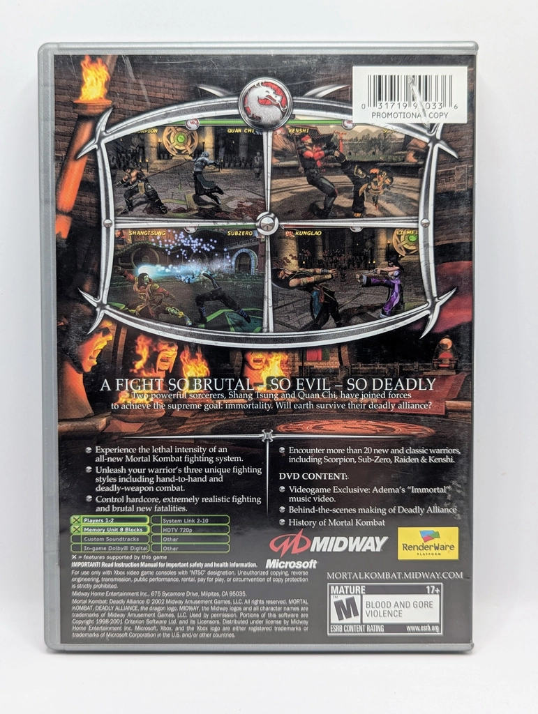 Step into the arena with Mortal Kombat: Deadly Alliance, the brutal revival that redefined the franchise with a deep, three-style fighting system and the debut of the legendary Konquest mode. This particular Promotional Copy is a unique piece of gaming history, originally distributed to press and retailers before the game’s official 2002 launch. While it features the same bone-shattering fatalities and dark sorcery as the retail version, its “Not For Resale” labeling and distinct packaging make it a standout curiosity for any hardcore Mortal Kombat collector. Whether you’re mastering Scorpion’s kunai or exploring the vast secrets of the Krypt, this promo version adds an extra layer of “Kombat” prestige to your Xbox library.