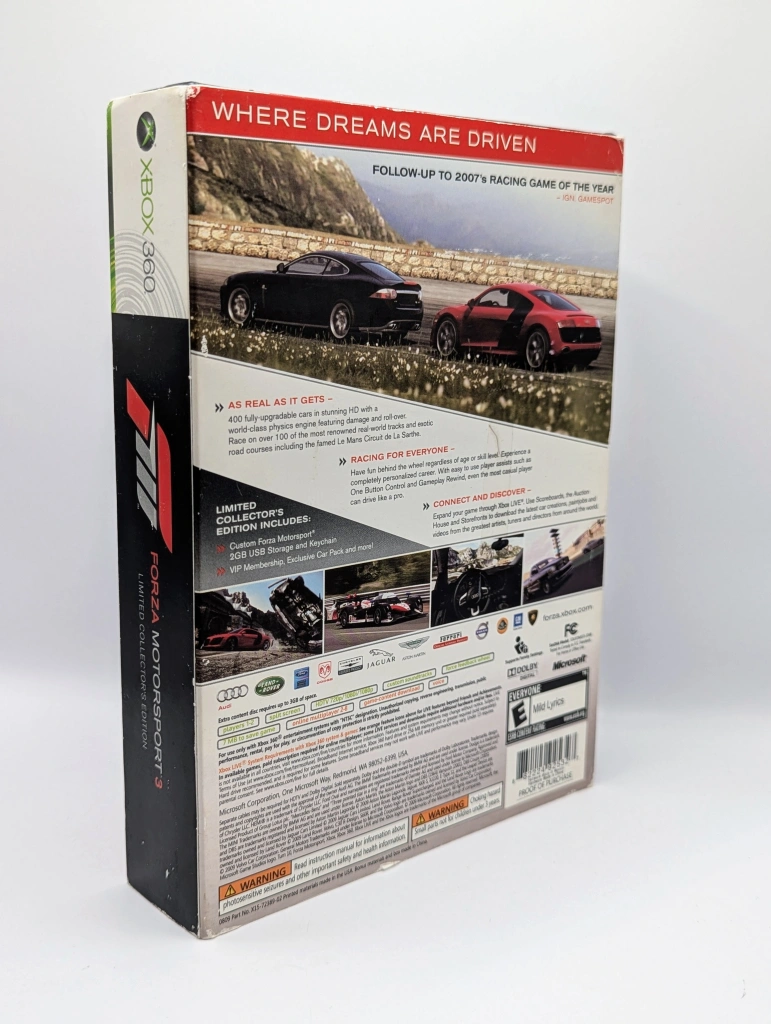 Drive your dreams to the limit with the Forza Motorsport 3: Limited Collector’s Edition, the ultimate celebration of automotive culture for the Xbox 360. This premium package puts you behind the wheel of over 400 beautifully rendered cars on more than 100 legendary tracks, all running at a breathtaking 60 frames per second. As a Collector’s Edition owner, you gain elite status with an exclusive Forza Motorsport 2GB USB flash drive, a custom-branded keychain, and instant access to the Exclusive VIP Membership, which grants you special recognition in the Forza community and a garage full of rare, tuned cars. With its revolutionary “rewind” feature for perfecting every corner and deep customization tools to paint and tune your ride, this edition is the definitive high-speed experience for racing purists and casual fans alike.