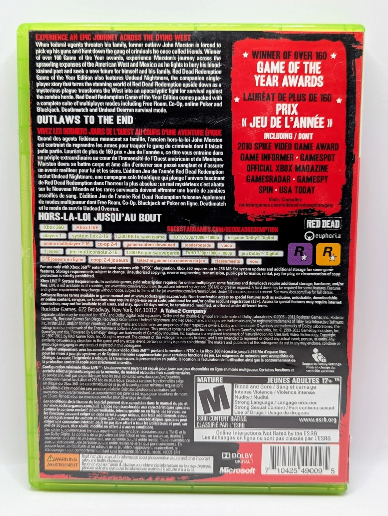 Saddle up for the definitive frontier experience in Red Dead Redemption: Game of the Year Edition. This massive package from Rockstar Games includes the original, award-winning Western epic following John Marston’s quest for peace, along with the legendary Undead Nightmare expansion—a supernatural twist that turns the Old West into a zombie-infested wasteland. As a “Platinum Hits” release, this edition also packs in all official DLC, including the Legends and Killers, Liars and Cheats, and Hunting and Trading packs, plus the “Outlaws to the End” Co-Op Mission Pack. Whether you’re hunting outlaws under the desert sun or fighting for survival against the horde, this GOTY edition offers hundreds of hours of top-tier gameplay and a sprawling, cinematic world that remains one of the greatest achievements on the Xbox 360.
