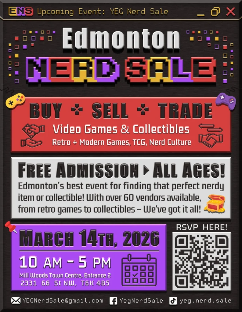 The Edmonton Nerd Sale returns on March 14, 2026, and we are thrilled to be the main sponsors once again! Join us at Mill Woods Town Centre for a massive day of gaming and pop culture. We’re bringing a huge selection of retro and modern titles to our booth, but we’re also looking to add to our inventory.